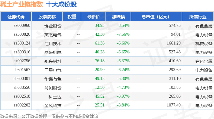 稀土产业链(989013)指数十大成份股详情如下:
