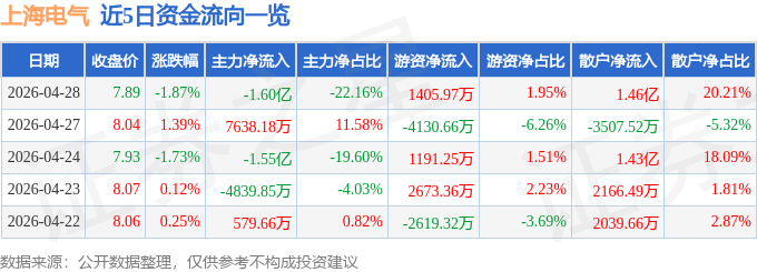 证券之星消息,截至2026年4月28日收盘,上海电气(601727)报收于7.89元,下跌1.87%,换手率0.72%,成交量91.1万手,成交额7.22亿元。
