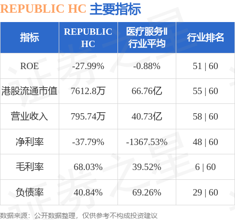 REPUBLIC HC港股市值7612.8万港元,在医疗服务Ⅱ行业中排名第55。主要指标见下表: