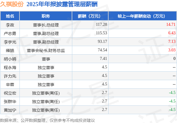 证券之星消息,久祺股份发布2025年年报,数据显示:公司主营收入33.61亿元,同比增20.54%。归母净利润为1.48亿元,同比增20.58%。扣非净利润为1.4亿元,同比增25.2%。当年公司员工总数1104人,同比增59.54%。人均薪酬14.24万元(注:"人均薪酬"根据定期报告中"应付职工薪酬"附注的本期增加值 / 员工总数计算而来),同比减21.8%。人均创收304.4万元,同比减24.44%。人均创利12.34万元,同比减29.71%。其中管理层薪酬总额为429.53万元,同比上一年减14.42%,薪酬最高的为董事长,总经理李政,薪酬117.28万元。