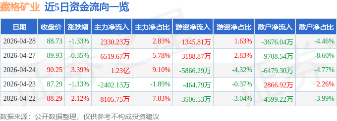 证券之星消息,截至2026年4月28日收盘,藏格矿业(000408)报收于88.73元,下跌1.33%,换手率0.59%,成交量9.27万手,成交额8.24亿元。