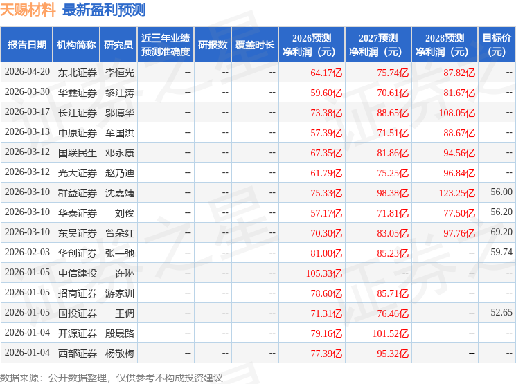 东吴证券股份有限公司曾朵红,阮巧燕,岳斯瑶近期对天赐材料进行研究并发布了研究报告《2026年一季报点评:多品类布局共享涨价弹性,业绩略超我们预期》,上调天赐材料目标价至76.0元,给予买入评级。