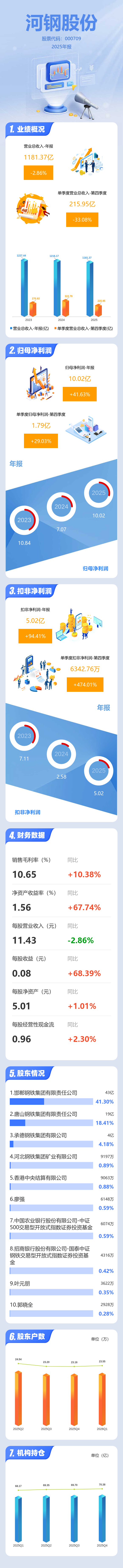 证券之星消息,河钢股份2025年年报显示,当年度公司主营收入1181.37亿元,同比下降2.86%;归母净利润10.02亿元,同比上升41.64%;扣非净利润5.02亿元,同比上升94.41%;其中2025年第四季度,公司单季度主营收入215.95亿元,同比下降33.08%;单季度归母净利润1.79亿元,同比上升29.04%;单季度扣非净利润6342.76万元,同比上升474.01%;负债率74.83%,投资收益6.27亿元,财务费用56.49亿元,毛利率10.65%。