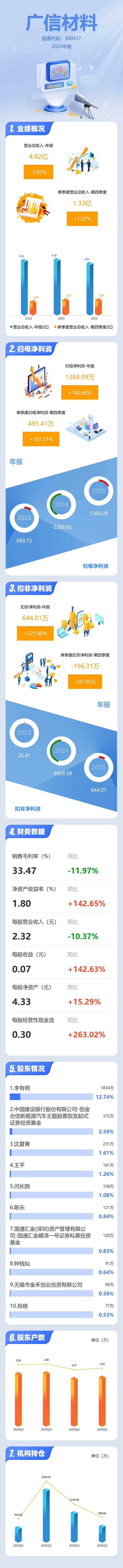 证券之星消息,广信材料2025年年报显示,当年度公司主营收入4.82亿元,同比下降7.07%;归母净利润1368.09万元,同比上升142.66%;扣非净利润644.01万元,同比上升121.4%;其中2025年第四季度,公司单季度主营收入1.33亿元,同比上升1.08%;单季度归母净利润491.41万元,同比上升107.22%;单季度扣非净利润-196.31万元,同比上升97.05%;负债率29.01%,投资收益44.23万元,财务费用517.5万元,毛利率33.47%。