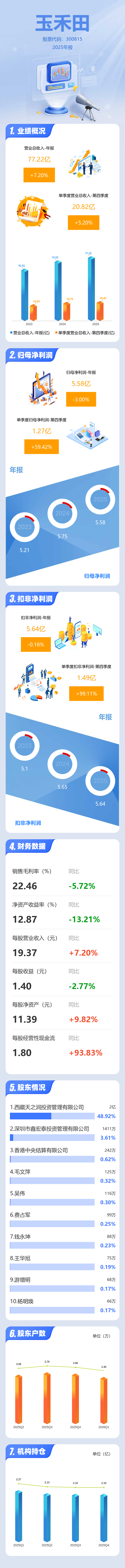 证券之星消息,玉禾田2025年年报显示,当年度公司主营收入77.22亿元,同比上升7.21%;归母净利润5.58亿元,同比下降3.01%;扣非净利润5.64亿元,同比下降0.16%;其中2025年第四季度,公司单季度主营收入20.82亿元,同比上升5.21%;单季度归母净利润1.27亿元,同比上升59.42%;单季度扣非净利润1.49亿元,同比上升99.11%;负债率51.32%,投资收益-1259.66万元,财务费用8495.75万元,毛利率22.46%。