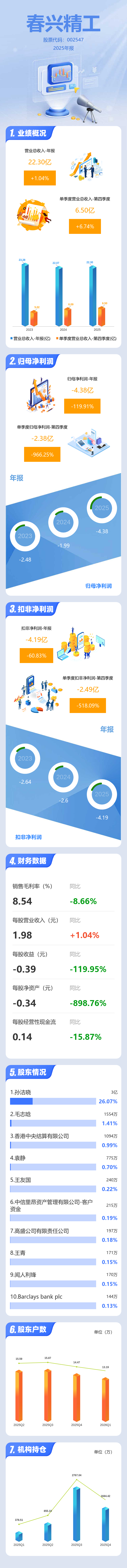 证券之星消息,春兴精工2025年年报显示,当年度公司主营收入22.3亿元,同比上升1.05%;归母净利润-4.38亿元,同比下降119.92%;扣非净利润-4.19亿元,同比下降60.84%;其中2025年第四季度,公司单季度主营收入6.5亿元,同比上升6.75%;单季度归母净利润-2.38亿元,同比下降966.26%;单季度扣非净利润-2.49亿元,同比下降518.1%;负债率108.17%,投资收益-254.45万元,财务费用8676.38万元,毛利率8.54%。