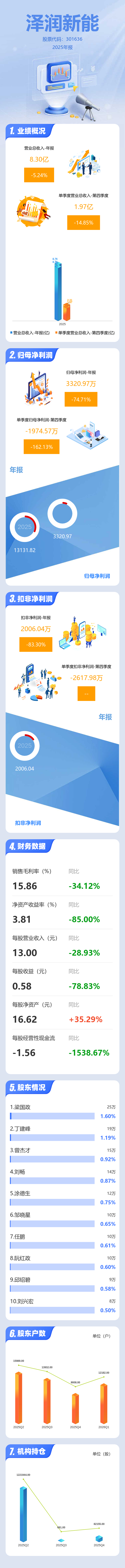 证券之星消息,泽润新能2025年年报显示,当年度公司主营收入8.3亿元,同比下降5.25%;归母净利润3320.97万元,同比下降74.71%;扣非净利润2006.04万元,同比下降83.31%;其中2025年第四季度,公司单季度主营收入1.97亿元,同比下降14.86%;单季度归母净利润-1974.57万元,同比下降162.13%;单季度扣非净利润-2617.98万元,负债率38.05%,投资收益16.33万元,财务费用61.15万元,毛利率15.86%。