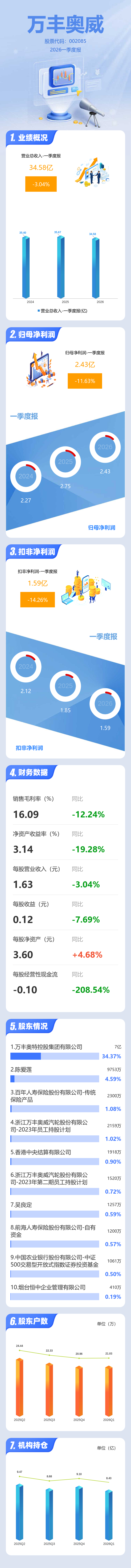 证券之星消息,万丰奥威2026年一季报显示,一季度公司主营收入34.58亿元,同比下降3.04%;归母净利润2.43亿元,同比下降11.64%;扣非净利润1.59亿元,同比下降14.27%;负债率44.69%,财务费用3446.31万元,毛利率16.09%。