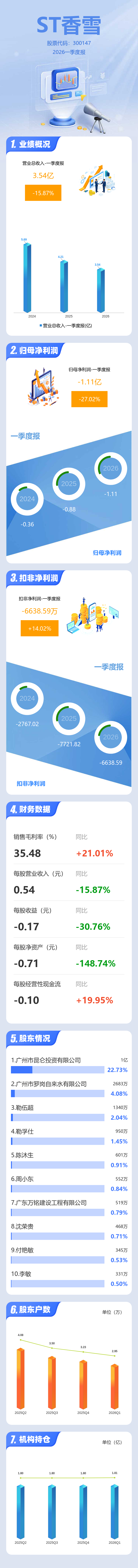 证券之星消息,ST香雪2026年一季报显示,一季度公司主营收入3.54亿元,同比下降15.88%;归母净利润-1.11亿元,同比下降27.02%;扣非净利润-6638.59万元,同比上升14.03%;负债率101.26%,投资收益-42.84万元,财务费用6867.09万元,毛利率35.48%。