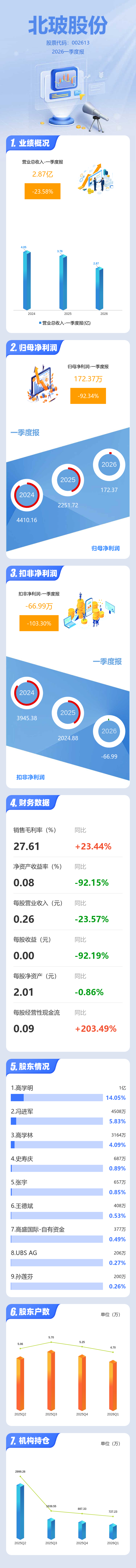 证券之星消息,北玻股份2026年一季报显示,一季度公司主营收入2.87亿元,同比下降23.58%;归母净利润172.37万元,同比下降92.34%;扣非净利润-66.99万元,同比下降103.31%;负债率23.82%,投资收益51.05万元,财务费用9.57万元,毛利率27.61%。