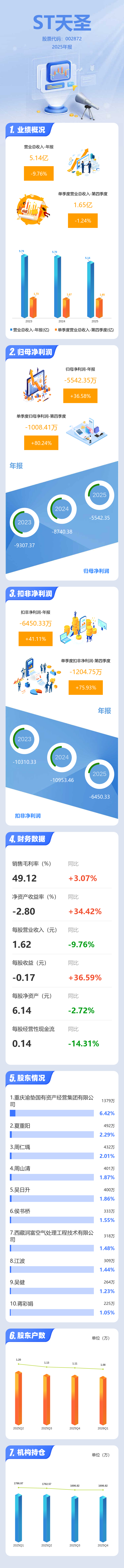 证券之星消息,ST天圣2025年年报显示,当年度公司主营收入5.14亿元,同比下降9.76%;归母净利润-5542.35万元,同比上升36.59%;扣非净利润-6450.33万元,同比上升41.11%;其中2025年第四季度,公司单季度主营收入1.65亿元,同比下降1.24%;单季度归母净利润-1008.41万元,同比上升80.25%;单季度扣非净利润-1204.75万元,同比上升75.94%;负债率25.92%,投资收益608.41万元,财务费用410.44万元,毛利率49.12%。