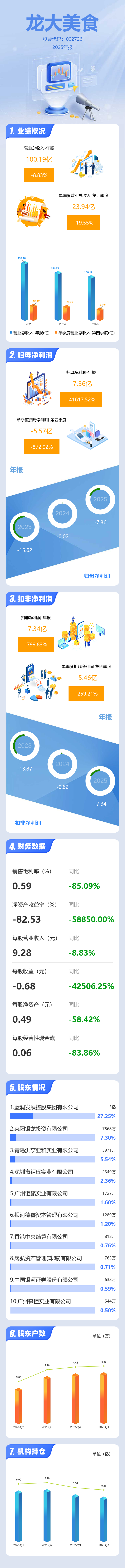 证券之星消息,龙大美食2025年年报显示,当年度公司主营收入100.19亿元,同比下降8.83%;归母净利润-7.36亿元,同比下降41617.52%;扣非净利润-7.34亿元,同比下降799.84%;其中2025年第四季度,公司单季度主营收入23.94亿元,同比下降19.56%;单季度归母净利润-5.57亿元,同比下降872.93%;单季度扣非净利润-5.46亿元,同比下降259.22%;负债率85.68%,投资收益69.03万元,财务费用1.27亿元,毛利率0.59%。