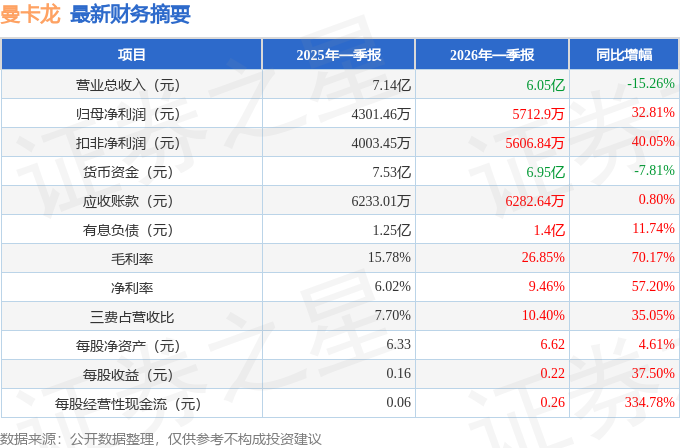 据证券之星公开数据整理,近期曼卡龙(300945)发布2026年一季报。截至本报告期末,公司营业总收入6.05亿元,同比下降15.26%,归母净利润5712.9万元,同比上升32.81%。按单季度数据看,第一季度营业总收入6.05亿元,同比下降15.26%,第一季度归母净利润5712.9万元,同比上升32.81%。本报告期曼卡龙三费占比上升明显,财务费用、销售费用和管理费用总和占总营收同比增幅达35.05%。