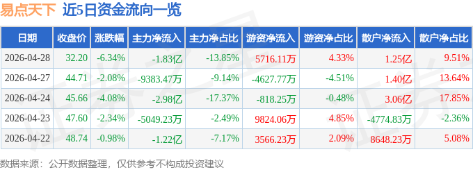 证券之星消息,截至2026年4月28日收盘,易点天下(301171)报收于32.2元,下跌6.34%,换手率8.15%,成交量40.49万手,成交额13.19亿元。