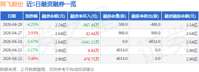 同飞股份融资融券信息显示,融资方面,当日融资买入2582.27万元,融资偿还3549.71万元,融资净偿还967.44万元。融券方面,融券卖出0.0股,融券偿还400.0股,融券余量500.0股,融券余额4.16万元。融资融券余额2.54亿元。