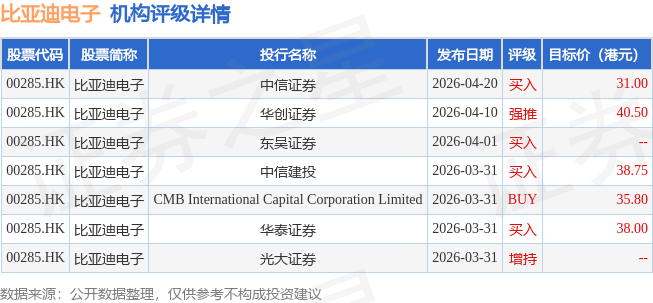 投行对该股的评级以买入为主,近90天内共有4家投行给出买入评级,近90天的目标均价为36.81港元。中信证券最新一份研报给予比亚迪电子买入评级,目标价31港元。