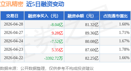 证券之星消息,4月28日,立讯精密(002475)融资买入14.61亿元,融资偿还22.65亿元,融资净卖出8.04亿元,融资余额81.32亿元。