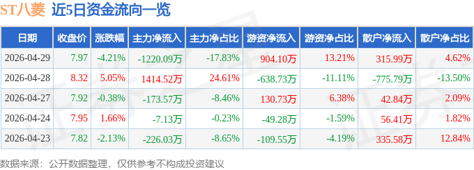 证券之星消息,截至2026年4月29日收盘,ST八菱(002592)报收于7.97元,下跌4.21%,换手率3.23%,成交量8.49万手,成交额6841.95万元。