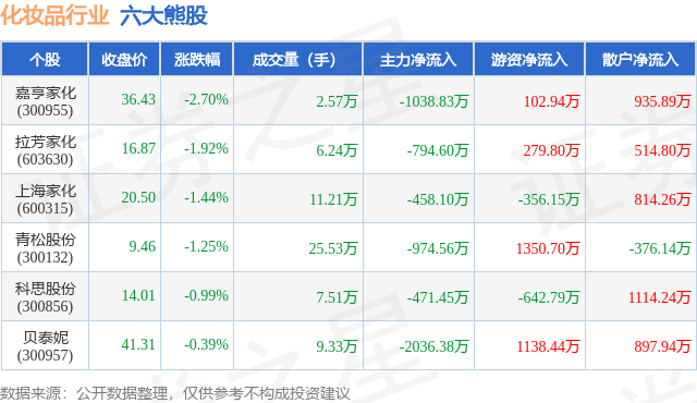 个股表现方面,化妆品行业当日领跌股为嘉亨家化(300955),该股当日报收36.43,下跌2.7%,成交量2.57万,主力资金净流出1038.83万元。拉芳家化(603630)以下跌1.92%紧随其后,该股当日成交量6.24万,主力资金净流出794.6万元。除此之外,上海家化(600315)、青松股份(300132)、科思股份(300856)均进入当日熊股之列。具体个股列表见下表: