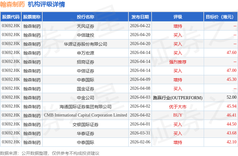 截至2026年4月29日收盘,翰森制药(03692.HK)报收于36.86港元,下跌1.18%,成交量523.73万股,成交额1.94亿港元。投行对该股的评级以买入为主,近90天内共有7家投行给出买入评级,近90天的目标均价为46.06港元。天风证券最新一份研报给予翰森制药增持评级。