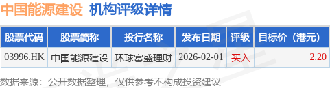 截至2026年4月29日收盘,中国能源建设(03996.HK)报收于1.31港元,上涨3.15%,成交量2599.8万股,成交额3371.27万港元。投行对该股的评级以买入为主,近90天内共有1家投行给出买入评级,近90天的目标均价为2.2港元。环球富盛理财最新一份研报给予中国能源建设买入评级,目标价2.2港元。