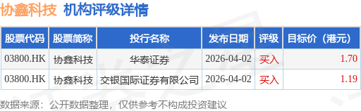 截至2026年4月29日收盘,协鑫科技(03800.HK)报收于0.95港元,上涨1.06%,成交量2.34亿股,成交额2.21亿港元。投行对该股的评级以买入为主,近90天内共有2家投行给出买入评级,近90天的目标均价为1.44港元。华泰证券最新一份研报给予协鑫科技买入评级,目标价1.7港元。
