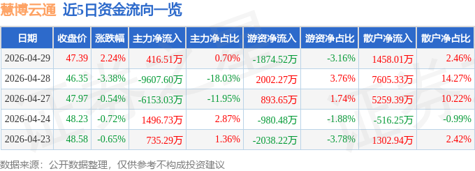证券之星消息,截至2026年4月29日收盘,慧博云通(301316)报收于47.39元,上涨2.24%,换手率3.17%,成交量12.42万手,成交额5.94亿元。