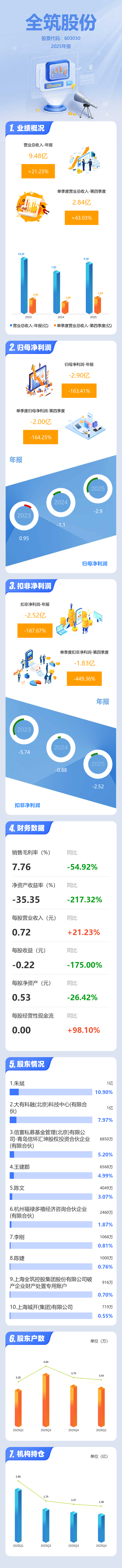 证券之星消息,全筑股份2025年年报显示,当年度公司主营收入9.48亿元,同比上升21.23%;归母净利润-2.9亿元,同比下降163.42%;扣非净利润-2.52亿元,同比下降187.68%;其中2025年第四季度,公司单季度主营收入2.84亿元,同比上升43.04%;单季度归母净利润-2.0亿元,同比下降164.26%;单季度扣非净利润-1.83亿元,同比下降449.36%;负债率61.35%,投资收益-567.92万元,财务费用3507.56万元,毛利率7.76%。