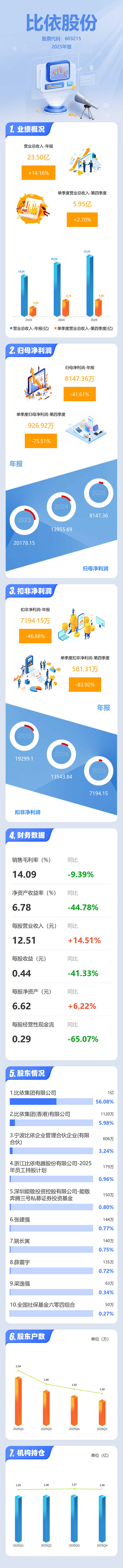 证券之星消息,比依股份2025年年报显示,当年度公司主营收入23.5亿元,同比上升14.17%;归母净利润8147.36万元,同比下降41.62%;扣非净利润7194.15万元,同比下降46.88%;其中2025年第四季度,公司单季度主营收入5.95亿元,同比上升2.7%;单季度归母净利润926.92万元,同比下降75.52%;单季度扣非净利润581.31万元,同比下降83.93%;负债率65.78%,投资收益430.21万元,财务费用123.63万元,毛利率14.09%。