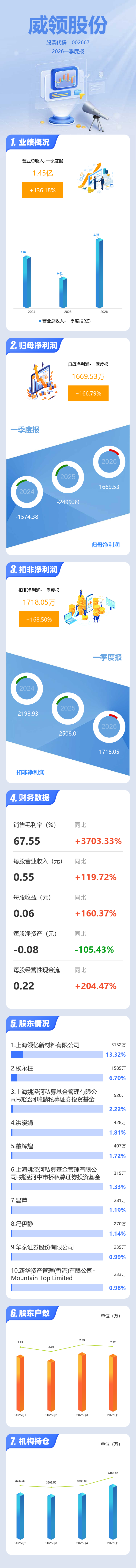 证券之星消息,威领股份2026年一季报显示,一季度公司主营收入1.45亿元,同比上升136.19%;归母净利润1669.53万元,同比上升166.8%;扣非净利润1718.05万元,同比上升168.5%;负债率89.52%,投资收益-21.88万元,财务费用1132.63万元,毛利率67.55%。