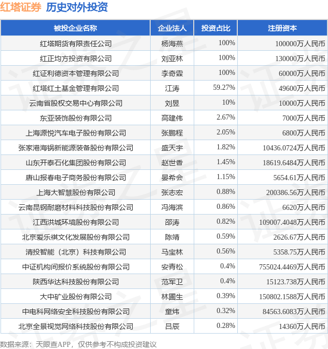 证券之星消息,根据天眼查APP显示,红塔证券(601236.SH)新增一起对外投资事件,被投资公司为陕西华达科技股份有限公司,法定代表人范军卫,投资占比为0.4%。该公司从事计算机、通信和其他电子设备制造业,注册资本为15123.738万人民币。目前,红塔证券共存在对外投资21项,投资占比前20的项目见下表: