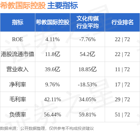 希教国际控股港股市值11.8亿港元,在文化传媒行业中排名第22。主要指标见下表: