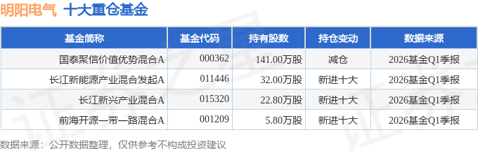 持有明阳电气最多的基金为国泰聚信价值优势混合A,目前规模为12.55亿元,最新净值3.087(4月29日),较上一交易日上涨1.88%,近一年上涨61.26%。该基金现任基金经理为程洲。