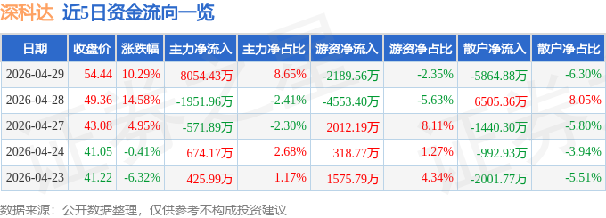 证券之星消息,截至2026年4月29日收盘,深科达(688328)报收于54.44元,上涨10.29%,换手率18.15%,成交量17.14万手,成交额9.31亿元。