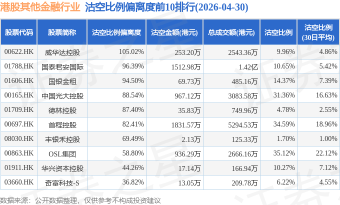 从沽空比例偏离度来看,威华达控股、国泰君安国际、国银金租沽空比例偏离度位居行业前三,分别为105.02%、96.39%、94.5%。