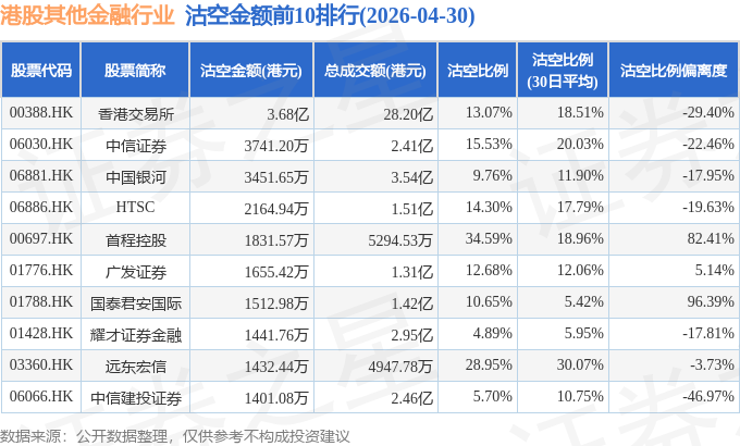 从沽空金额来看,香港交易所、中信证券、中国银河沽空金额位居行业前三,分别为3.68亿港元、3741.2万港元、3451.65万港元。