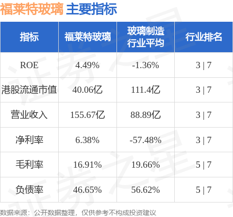福莱特玻璃港股市值40.06亿港元,在玻璃制造行业中排名第3。主要指标见下表: