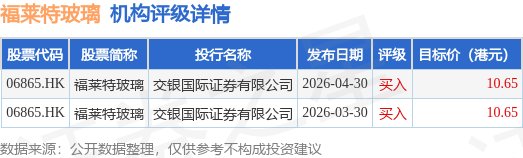 截至2026年4月30日收盘,福莱特玻璃(06865.HK)报收于8.97港元,下跌1.1%,成交量281.85万股,成交额2543.27万港元。投行对该股的评级以买入为主,近90天内共有2家投行给出买入评级,近90天的目标均价为10.65港元。交银国际证券有限公司最新一份研报给予福莱特玻璃买入评级,目标价10.65港元。