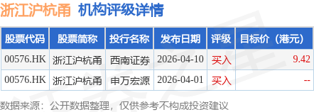 截至2026年4月30日收盘,浙江沪杭甬(00576.HK)报收于7.76港元,下跌0.51%,成交量1075.63万股,成交额8382.58万港元。投行对该股的评级以买入为主,近90天内共有2家投行给出买入评级,近90天的目标均价为9.42港元。西南证券最新一份研报给予浙江沪杭甬买入评级,目标价9.42港元。
