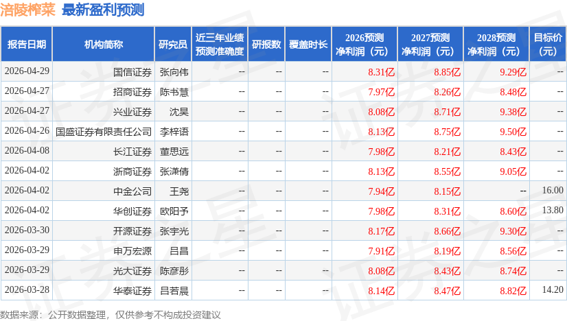 开源证券股份有限公司张宇光,方一苇近期对涪陵榨菜进行研究并发布了研究报告《公司信息更新报告:2026Q1稳健增长,收入利润符合预期》,给予涪陵榨菜买入评级。