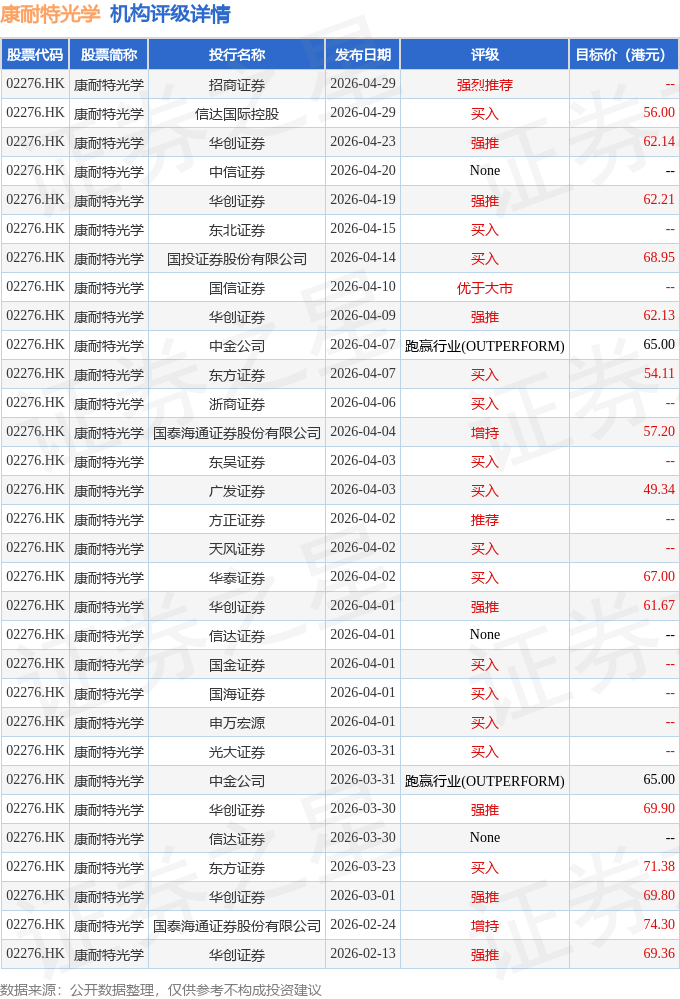 截至2026年4月30日收盘,康耐特光学(02276.HK)报收于47.14港元,下跌3.04%,成交量215.81万股,成交额1.02亿港元。投行对该股的评级以买入为主,近90天内共有14家投行给出买入评级,近90天的目标均价为63.85港元。招商证券最新一份研报给予康耐特光学强烈推荐评级。
