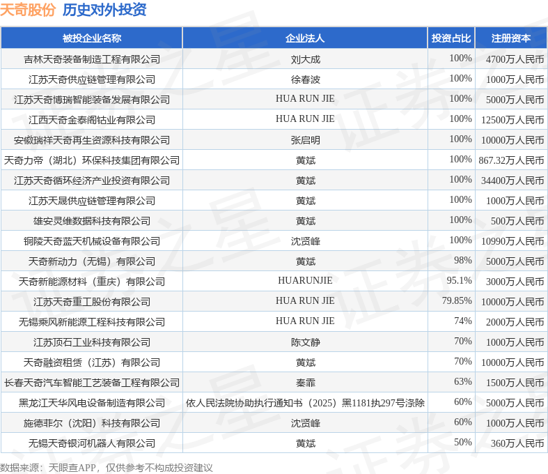 通过天眼查大数据分析,天奇自动化工程股份有限公司共对外投资了41家企业,参与招投标项目316次;财产线索方面有商标信息118条,专利信息1812条,著作权信息22条;此外企业还拥有行政许可101个。据2025年报数据,天奇股份商誉3.61亿元,同比未变化。长期股权投资3.12亿元,同比增10.16%。