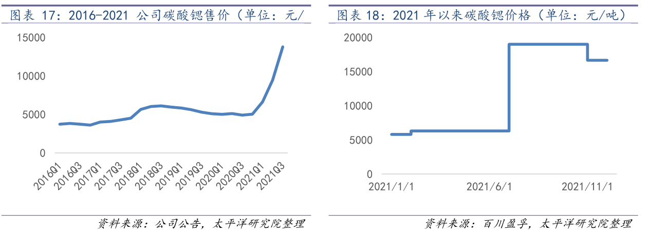 钡盐价格历史波动不大,公司季度销售均价在2000-3000元波动。但是2021年下半年明显涨价,主要受到需求扩张和成本抬升影响。百川盈孚数据显示,行业主要钡盐企业价格明显上涨,其中硫酸钡较年初上涨20%,碳酸钡上涨38%,碳酸钡在三季度以后涨势明显,有望提升公司未来业绩。