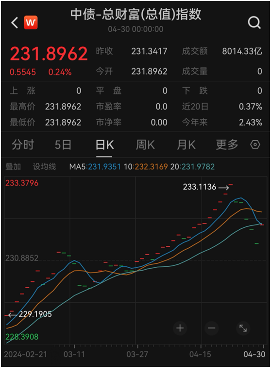 从中债一总财富(总值)指数表现来看,4月24日至4月29日,区间下跌0.76%,创年内最大回撤。