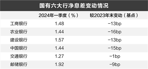 具体来看,今年一季度,工、农、建、中、交、邮储六大行的净息差水平分别为1.48%、1.44%、1.57%、1.44%、1.27%和1.92%,较2023年末分别下降了13个基点、16个基点、13个基点、15个基点、1个基点和9个基点,降幅较去年同期收窄了2至14个基点不等。