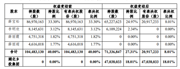 2024年10月22日,湖北乡投集团与薛宝松、李明欣签署了《表决权放弃协议》,约定薛宝松、李明欣自愿、无条件且不可撤销地放弃其持有的上市公司50,419,614股股份(占上市公司股份总数的19.30%)所对应的表决权,以保障本次权益变动完成后湖北乡投集团对上市公司的控制权。