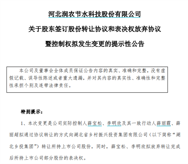 润农节水10月25日晚公告,公司实控人薛宝松、李明欣及其一致行动人拟向湖北乡投集团转让所持股份,并放弃部分股份表决权。交易完成后,公司实控人将变更为湖北省国资委,湖北乡投集团为公司新的控股股东。公司股票将在10月28日复牌。