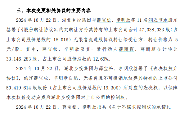 润农节水10月25日晚公告,湖北乡投集团与薛宝松、李明欣等11名润农节水股东签署了《股份转让协议》,约定转让方将其持有的上市公司合计47,038,033股(占上市公司股份总数的18.01%)无限售流通股协议转让给受让方,转让价格为5元/股。其中,薛宝松、李明欣及其一致行动人薛丽霞、薛丽超合计转让33,146,283股,占上市公司股份总数的12.69%。