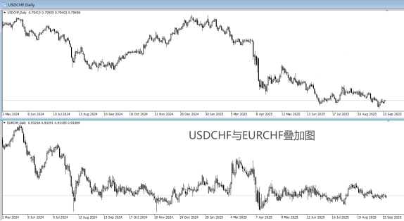 瑞郎系货币对中,USDCHF和EURCHF关注度最高。上图为美瑞和欧瑞的叠加图,两者走势共振性较强。中期趋势看,美元和欧元相对瑞郎均存在贬值趋势,这看似与瑞郎持续降息的影响相反。实际上,瑞郎是避险货币,虽然2015年的瑞郎黑天鹅事件令瑞郎的避险属性下降,但其依旧是国际资金追捧的对象。在美国总统特朗普一系列关税政策下,全球经济前景预期悲观。由于美元信用下降,美元指数下跌,瑞郎的避险属性凸显,这才导致即便瑞士央行降息,也还是导致瑞郎升值的原因。