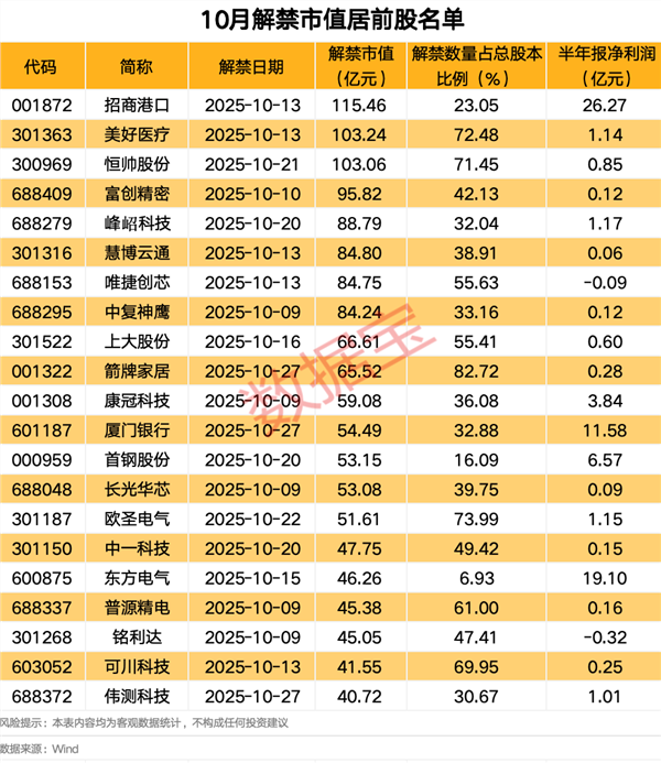 上述解禁股中,3只解禁市值超百亿元,分别是招商港口、美好医疗、恒帅股份。招商港口10月将有5.77亿股上市流通,主要为定向增发机构配售股份,解禁市值达115.46亿元。